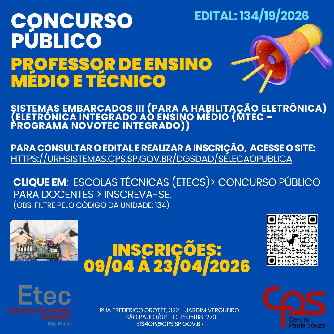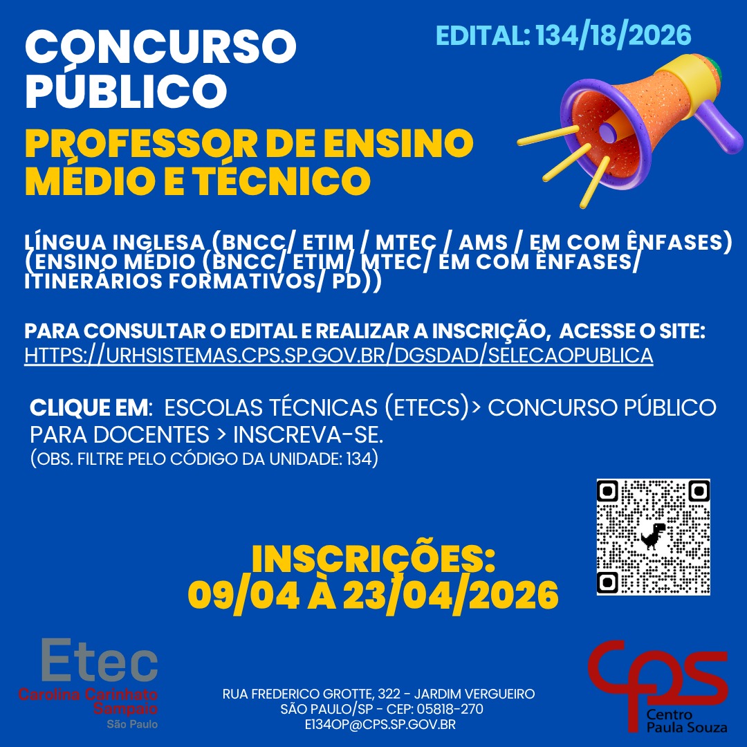 A Etec Carolina Carinhato Sampaio divulga os últimos editais para contratação, por concurso público, de professores de Ensino Médio e Técnico por prazo indeterminado.
