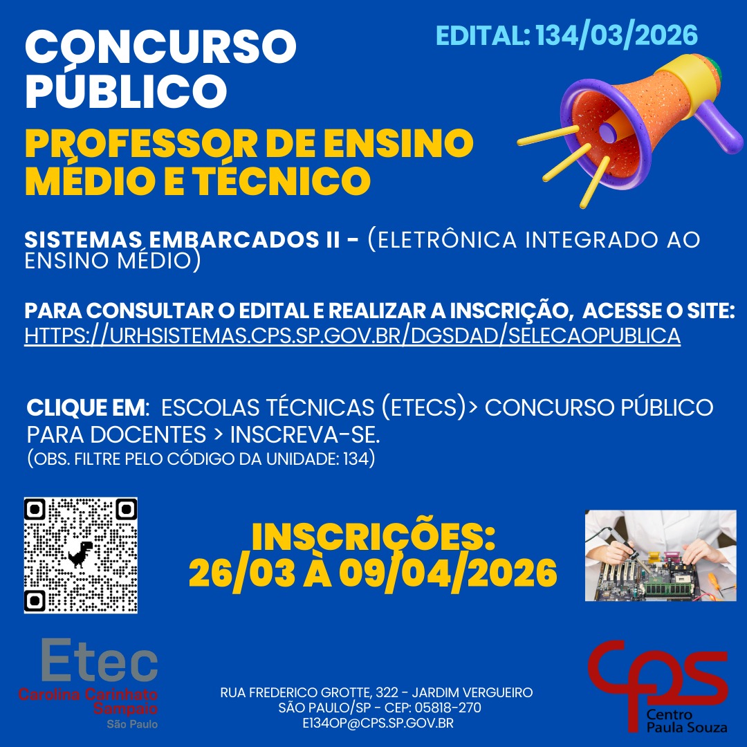 - Edital 134/03/2026: Sistemas Embarcados II – (ELETRÔNICA INTEGRADO AO ENSINO MÉDIO) – Manhã