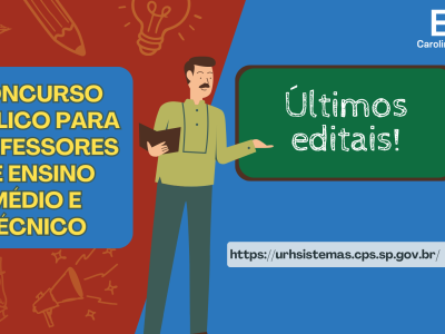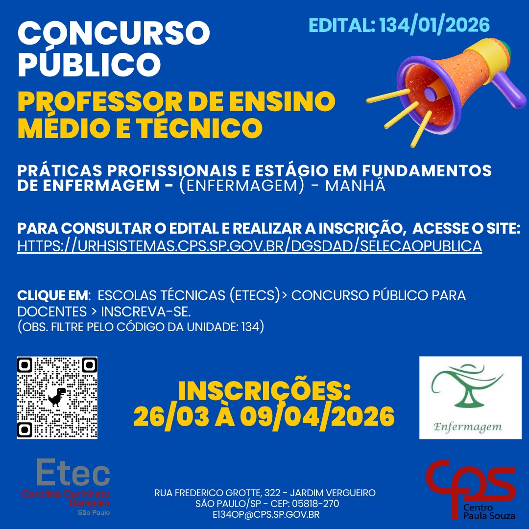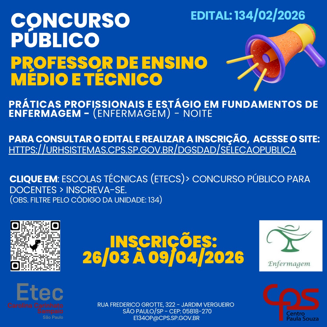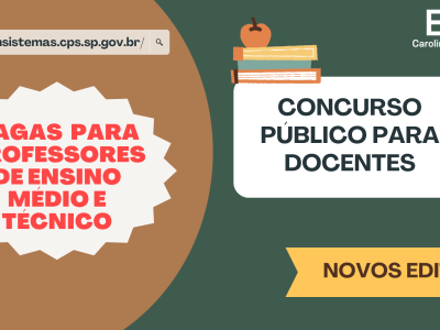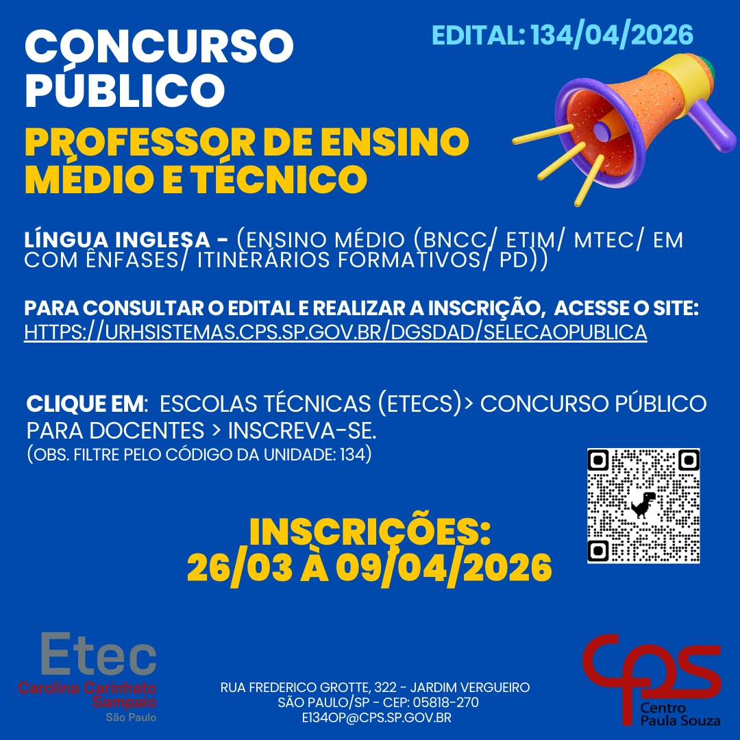 A Etec Carolina Carinhato Sampaio divulga a abertura dos editais 134/01/2026, 134/02/2026, 134/03/2026 e 134/04/2026, para contratação, por concurso público, de professores de Ensino Médio e Técnico por prazo indeterminado.