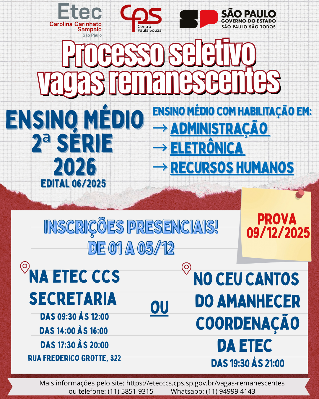 Inscreva-se para ingressar na 2ª Série/Ano do Ensino Médio até dia 05/12/2025. Confira o edital em Vagas Remanescentes